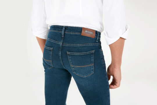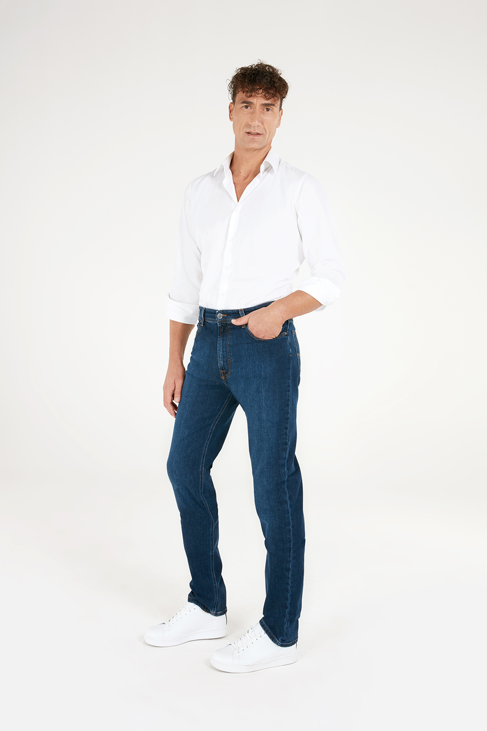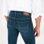 L’essenziale unito alla comodità del tessuto stretch, fa di questo modello un “mai più senza”. SLIM FIT, vita regolare e gamba slim, espresso nel suo look versatile: base blu denim scuro dettagliato da sabbiatura tendente al corda con impuntura a contrasto in tela denim 11 oz.
