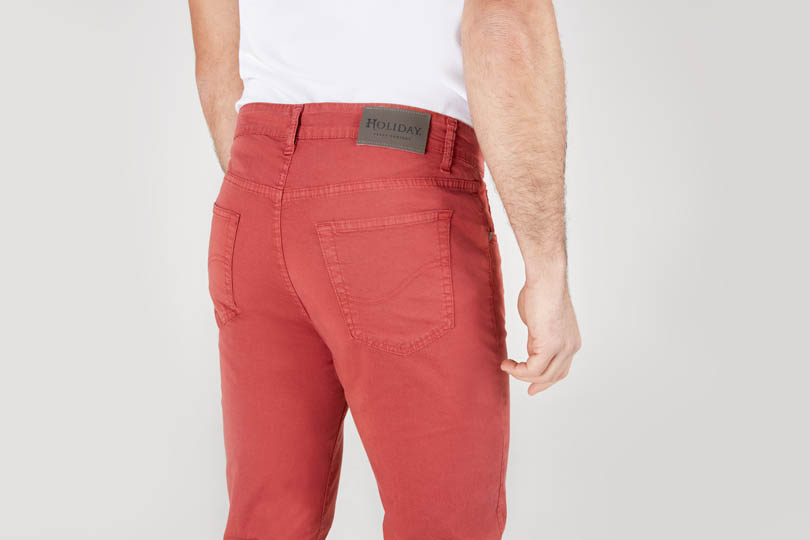 La storica vestibilità del marchio HOLIDAY, declinata in chiave estiva: ETAN, realizzato in gabardina di cotone stretch colorata, vita alta e fondo regolare, disponibile in una ricca palette color per poter essere al passo con ogni esigenza.