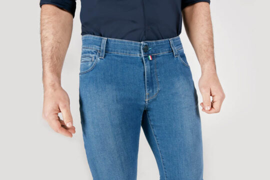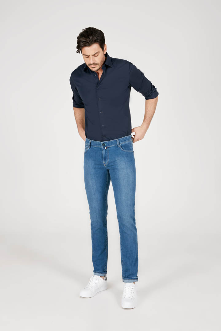 Dettagli: non mancano di certo nel modello KARTER. Il fascino del modello cinque tasche, impreziosito dal doppio taschino sia nella tasca anteriore che posteriore e dal bottone logato in stile black. Vestibilità SLIM FIT, vita regolare e fondo slim, in tela soft denim stretch 9 oz.